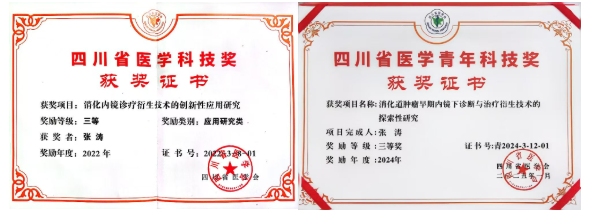 在12例高难度胃底肿瘤治疗中实现了100%完整切除率(符合共识最高标准)!零术中并发症(无中转手术、无术中大出血、无穿孔)!零术后并发症(无迟发性出血、无感染且未使用抗生素)!这一卓越的初步数据,充分证明了该技术的巨大潜力和极高的安全性。 这些登顶国际顶刊的原创技术和优异临床结果,不仅强有力地印证了共识核心观点——内镜技术能实现与外科手术同等的根治效果,同时显著降低了创伤和经济负担——更以经国际同行评议的硬核数据,为早期胃肿瘤患者提供了经科学验证的更优微创治疗选择。相关创新技术的详细手术视频已通过国际期刊的开放获取平台向全球同行免费共享,无私贡献“中国经验”和“南充方案”。 北京安贞医院南充医院消化内科团队正积极筹备牵头国内多中心临床研究,旨在通过更高级别的循证医学证据,推动这些成熟可靠的技术写入国际权威指南,惠及更广泛的患者群体。 荣誉见证实力 北京安贞医院南充医院张涛教授因其在胃肿瘤内镜微创治疗领域的系统性创新和突出贡献,荣获2022年四川省医学科技奖三等奖及四川省医学青年科技奖三等奖。