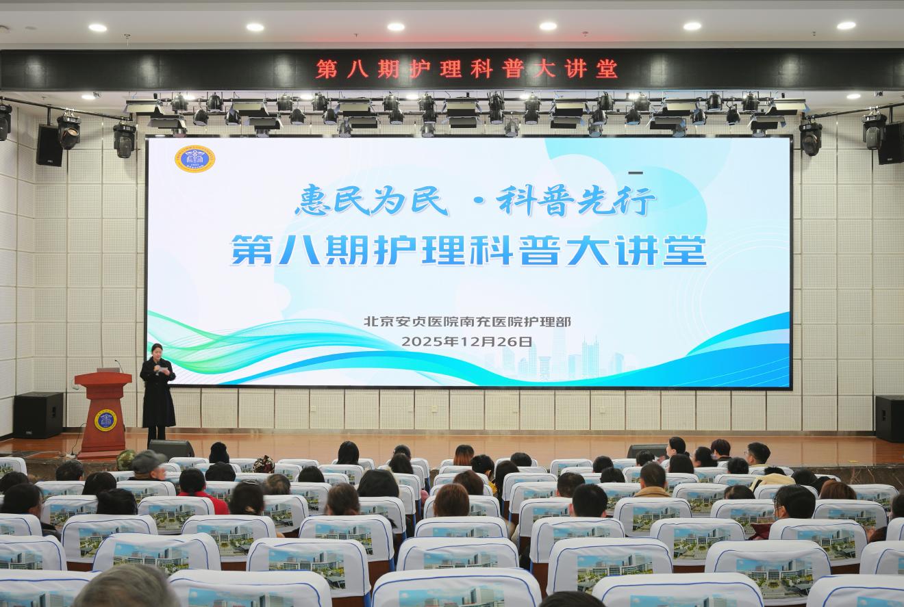 北京安贞医院南充医院举办第八期护理科普大讲堂发表时间:2026-01-09 12:08来源:护理部 为落实2025 年健康科普工作部署,提升患者及家属健康认知水平,搭建医患沟通桥梁,12月26日,首都医科大学附属北京安贞医院南充医院·南充市中心医院(简称“北京安贞医院南充医院”)第八期护理科普大讲堂在江东院区科研学术厅举行。护士、患者及家属代表近百人齐聚一堂,共同畅享这场实用满满的健康知识盛宴。