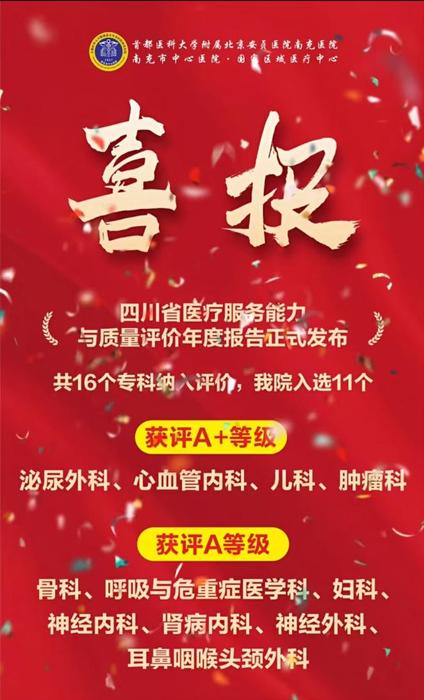 我院11个专科上榜!全省医疗服务能力与质量评价年度报告正式发布发表时间:2026-01-09 12:10来源:医务科 近日,四川省卫生健康委员会对全省三级医院16个临床专科开展医疗服务能力与质量评价,首都医科大学附属北京安贞医院南充医院·南充市中心医院(简称“北京安贞医院南充医院”)共11个专科上榜,其中泌尿外科、心血管内科、儿科、肿瘤科评级为A+,骨科、呼吸内科、神经内科、肾病内科、神经外科、妇科、耳鼻喉科评级为A。